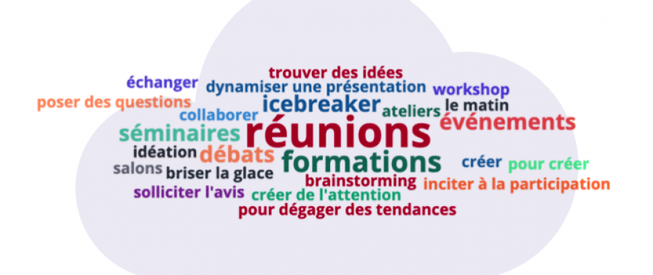 Le nuage de mots est un outil qui s’adapte parfaitement lorsque vous voulez faire apparaître des idées en temps réel. Nombreux sont les usages possibles : en réunion, en formation, pendant un workshop ou lors d’une présentation. Voici 5 moments de la vie quotidienne d’une équipe ou le nuage de mots peut être utilisé.
