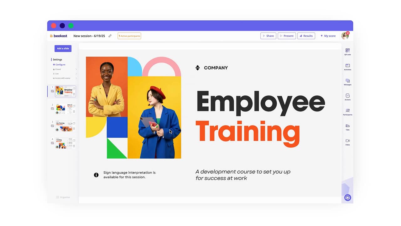 Beekast est un logiciel de formation interactive qui aide les formateurs, coachs et équipes L&D à animer des ateliers en ligne, sessions hybrides ou formations en présentiel. Utilisez des activités collaboratives, des analyses avancées et des modèles prêts à l’emploi pour créer des moments d’apprentissage modernes, engageants et mémorables.